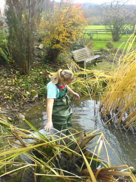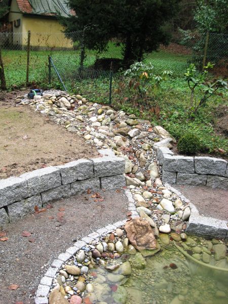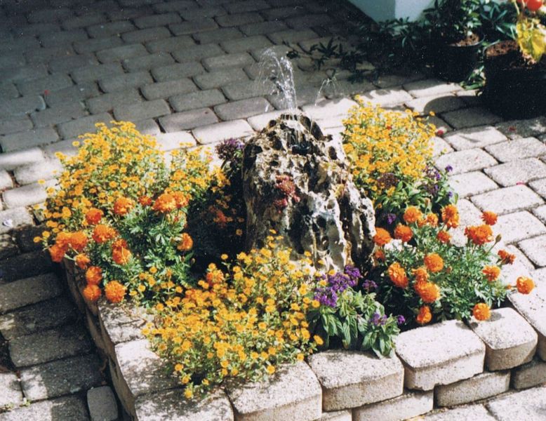 Gartenbrunnen mit Lochstein, eingepasst in die bestehende Umgebung